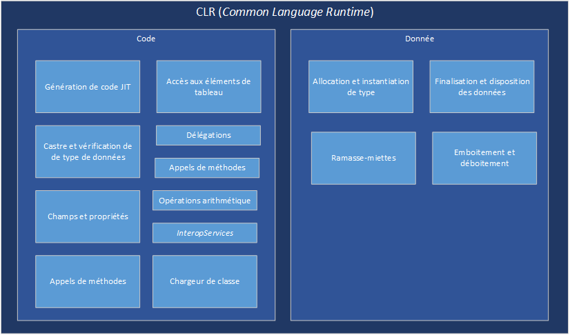 Le CLR n'est pas qu'un simple intermédiaire, au contraire, le CLR inclus d'autres fonctionnalités comme le chargeur de classe (Class Loader), un MSIL ou CIL en compilateur de code natif (convertissant le code MSIL en code natif), un gestionnaire de code (gestionnaire gérant le code pendant l'exécution, c'est-à-dire le contrôle du code, les ressources nécessaires au cours de l'exécution), ramasse-miettes, des opérations basées sur des piles, la gestion des processus léger, une sécurité au niveau de l'exécution, des méthodes pour la gestion des exceptions, un moteur de débogage (permettant de déboguer différents types d'applications), et la prise en charge des métadonnées définies par l'utilisateur.
