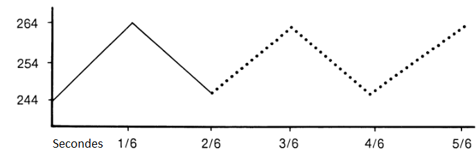 Supposons que vous appeliez le tableau VIBRATO%() et que vous spécifiiez la valeur de période initiale à 244. Une oscillation rapide entre 244 et 264 sonnera comme un A (de période 254) à l'oreille. Supposons en outre qu'il y ait trois cycles de vibrato de haut en bas par seconde, et donc 1/6 de seconde s'écoule entre chaque extrême sur le graphique ci-dessus. Ainsi, les valeurs de tableau correspondantes pour la commande PERIOD à utiliser sont :