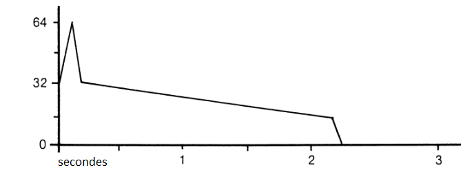 Le tableau contient des paires successives de valeurs de pente et de destination. La commande SOUND lançant le son contient une valeur de volume initiale. La commande VOLUME utilise cette valeur comme volume à partir duquel commencer. Par exemple, la valeur initiale donnée dans la commande SOUND peut être 32. La figure suivante montre comment utiliser cette valeur comme point de départ pour décrire une enveloppe sonore typique (la variation de volume dans le temps distinguant différents instruments et sons naturels) pour un note frappée au piano :