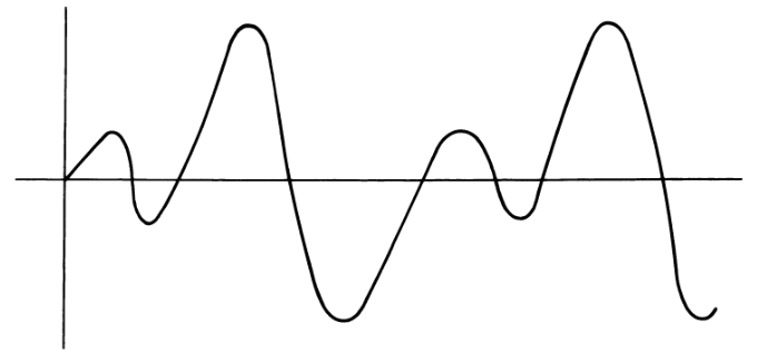 Il existe un certain nombre de formes d'onde que vous pouvez créer pour obtenir différentes qualités sonores. Par exemple, un motif erratique crée un son similaire à la radio statique, ou "bruit blanc", ayant de nombreuses utilisations. Pour créer un type de forme d'onde complexe, vous pouvez additionner les ondes sinusoïdales des composantes. Par exemple, la première harmonique de l'onde de la figure précédente est une tonalité de fréquence supérieure à la fondamentale. Ainsi, pour chaque cycle de la fondamentale, il y a plusieurs cycles de l'harmonique. La somme des deux formes d'onde a un graphique comme dans la figure ci-dessous :
