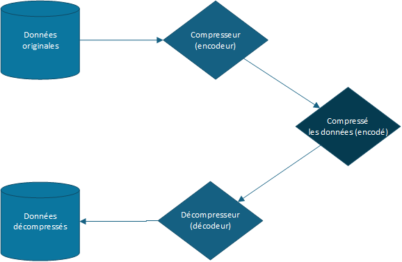 D'un point de vue conceptuel, le fonctionnement de la compression peut être représenté par un schéma de flux clair et linéaire. Les données originales sont d'abord transmises à un encodeur, dont le rôle est de transformer ces informations brutes en données compressées, plus compactes et plus faciles à entreposer ou à transmettre. Ces données compressées sont ensuite prises en charge par un décodeur, qui effectue l'opération inverse en recréant les données décompressées, identiques aux données initiales. Ce va-et-vient entre encodage et décodage constitue le cour même du mécanisme de compression proposé par le cadre d'application.