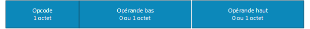 Le premier octet est toujours l'opcode, identifiant à la fois l'instruction et le mode d'adressage. Les octets suivants sont l'opérande (adresse ou valeur immédiate), si nécessaire.