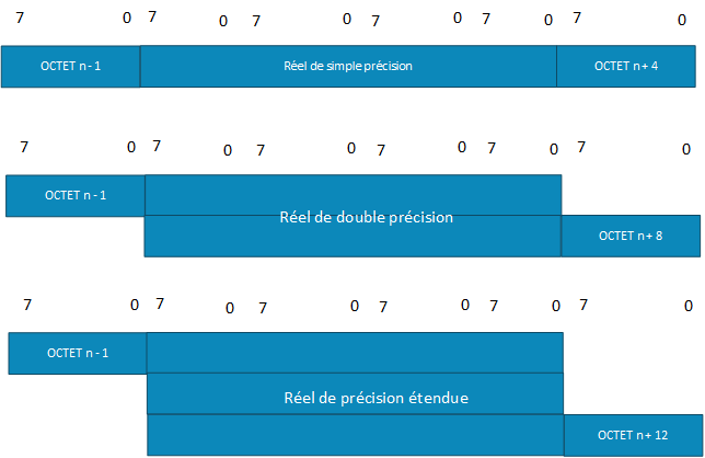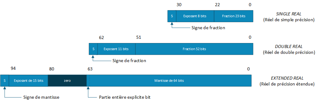 La figure suivante illustre le format des données à virgule flottante pour l'organisation des données réelles binaires en mémoire à simple, double et étendue précision :