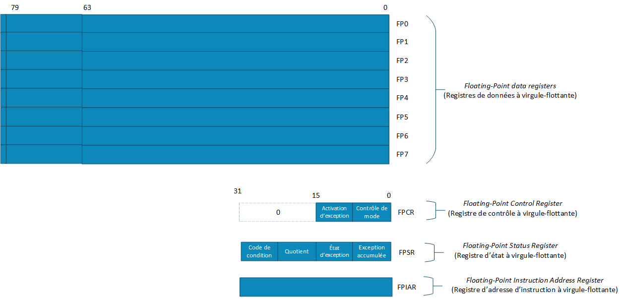- 8 registres de données à virgule flottante (FP7 - FP0)