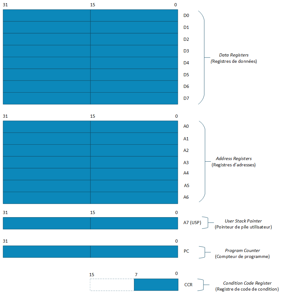 - 16 registres généraux 32 bits (D7 à D0, A7 à A0)