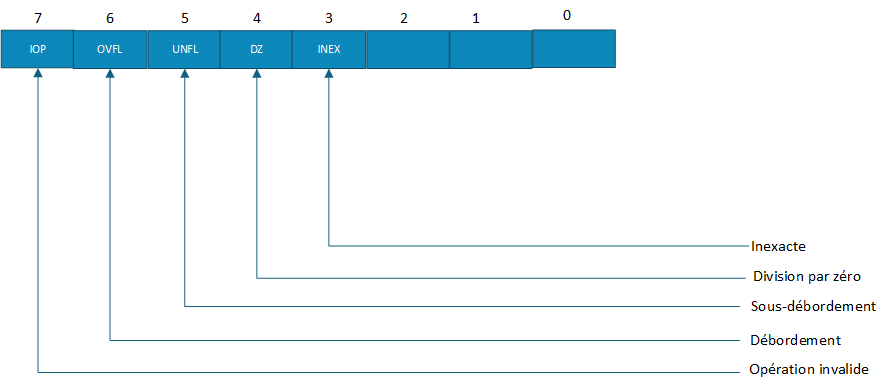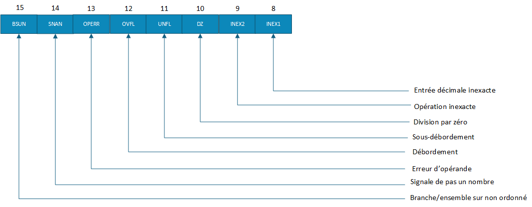 OCTET D'ÉTAT D'EXCEPTION : L'octet EXC, illustré dans la figure suivante, contient un bit pour chaque exception à virgule flottante susceptible de s'être produite lors de la dernière instruction arithmétique ou opération de déplacement. Cet octet est effacé au début de toutes les opérations générant des exceptions à virgule flottante. Les opérations ne générant pas d'exceptions à virgule flottante ne réinitialisent pas cet octet. Un gestionnaire d'exceptions peut utiliser cet octet pour déterminer quelle(s) exception(s) à virgule flottante a/ont provoqué une interruption.