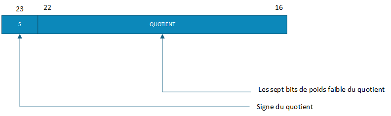 OCTET QUOTIENT : L'octet quotient contient les sept bits de poids faible du quotient non signé ainsi que le signe du quotient entier (voir figure suivante). Les bits quotient peuvent être utilisés pour la réduction d'arguments des fonctions transcendantes et autres. Par exemple, sept bits suffisent amplement pour déterminer le quadrant d'un cercle dans lequel se trouve un opérande. Les bits quotient restent à 1 jusqu'à ce que l'utilisateur les efface.