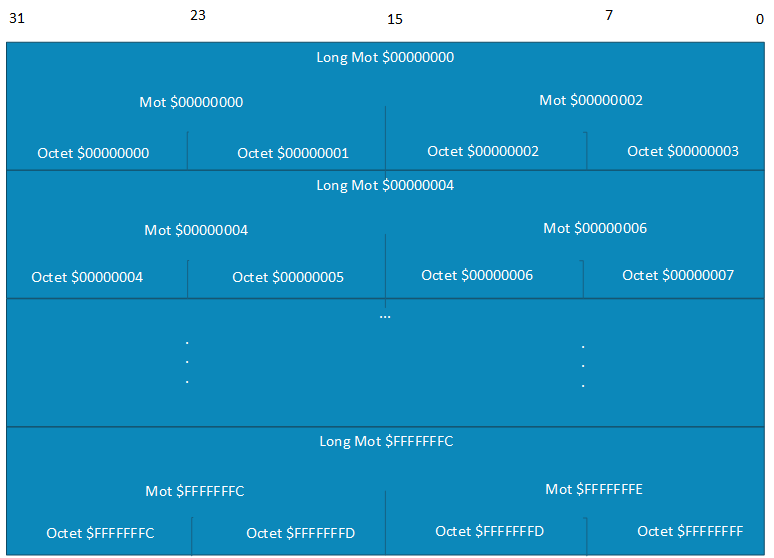 L'organisation de la mémoire par adressage octet permet aux adresses les plus basses de correspondre aux octets de poids fort. L'adresse N d'un élément de données de type mot long correspond à l'adresse du bit de poids fort (MSB) du mot de poids fort. Le mot de poids faible se situe à l'adresse N + 2, le bit de poids faible (LSB) se trouvant à l'adresse N + 3 (voir figure suivante). L'organisation des formats de données en mémoire est conforme à celle de la famille M68000. L'adresse la plus basse (la plus proche de $00000000) correspond à l'emplacement du MSB, chaque LSB suivant se trouvant à l'adresse suivante (N + 1, N + 2, ...). L'adresse la plus élevée (la plus proche de $FFFFFFFF) correspond à l'emplacement du LSB.