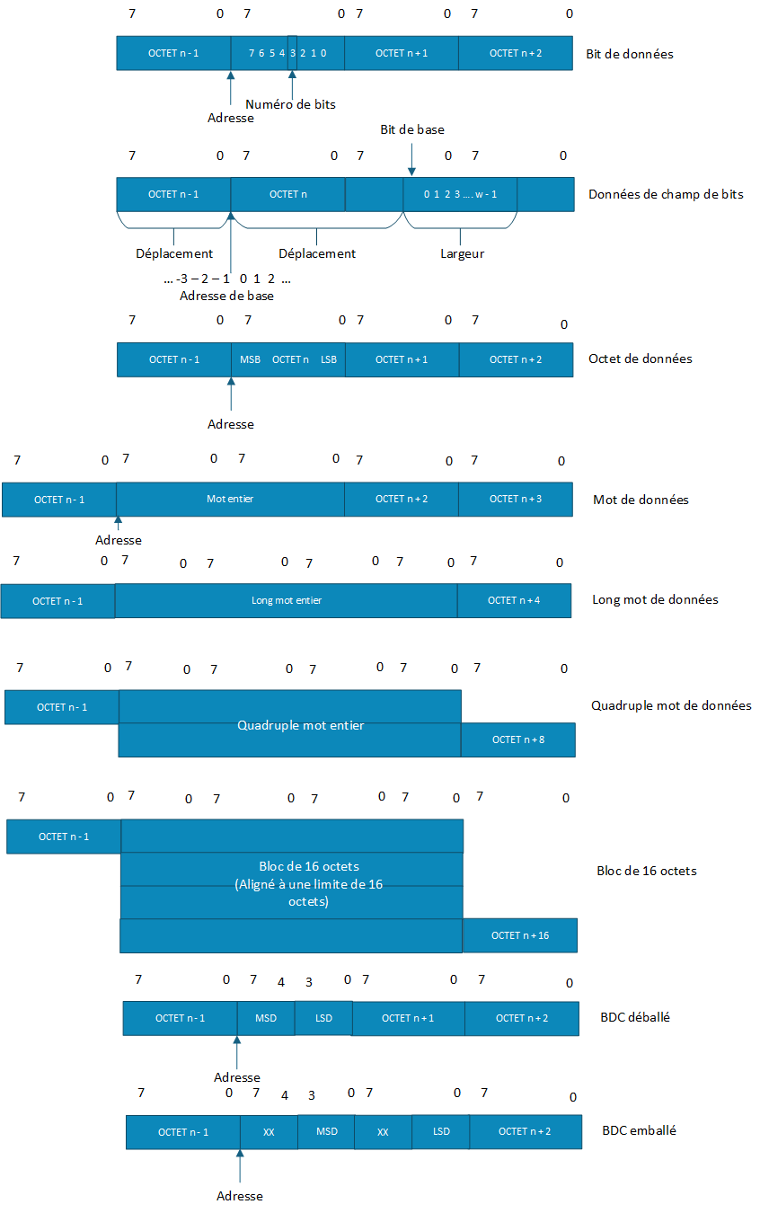 La figure suivante illustre l'organisation des formats de données IU en mémoire. Une adresse de base, sélectionnant un octet en mémoire (l'octet de base), spécifie un numéro de bit qui sélectionne un bit (l'opérande) dans cet octet de base. Le bit de poids fort (MSB) de l'octet est 7.