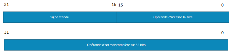 Les registres d'adresse et les pointeurs de pile étant codés sur 32 bits, ils ne peuvent pas être utilisés pour des opérandes de la taille d'un octet. Lorsqu'un registre d'adresse est l'opérande source, seul le mot de poids faible ou l'opérande entier (mot long) est utilisé, selon la taille de l'opération. Lorsqu'un registre d'adresse est l'opérande de destination, c'est le registre entier qui est affecté, quelle que soit la taille de l'opération. Si l'opérande source est de la taille d'un mot, il est étendu à 32 bits avant d'être utilisé dans l'opération vers un registre d'adresse de destination. Les registres d'adresse servent principalement à la gestion des adresses et au calcul des adresses. Le jeu d'instructions comprend des instructions permettant d'ajouter, de comparer et de déplacer le contenu des registres d'adresse. La figure suivante illustre l'organisation des adresses dans les registres d'adresse.
