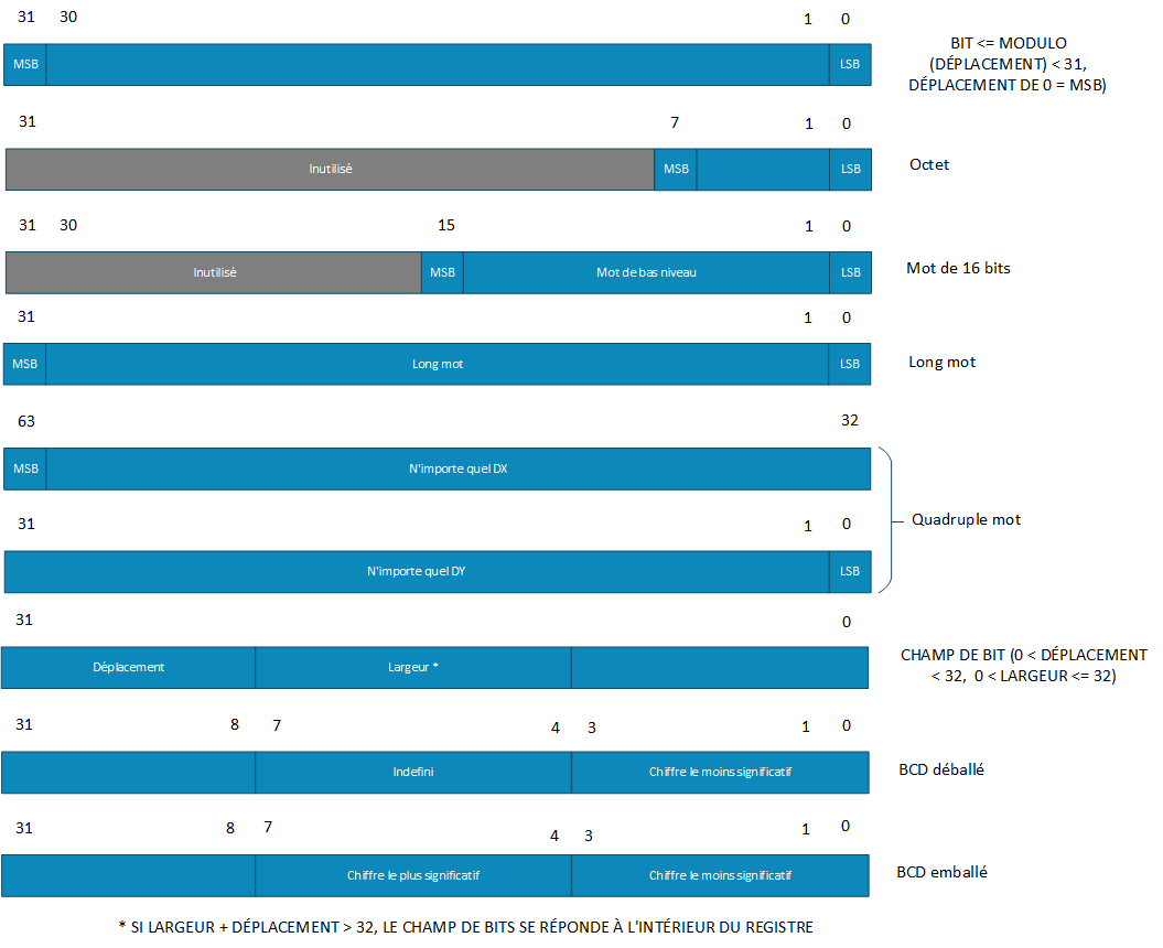Chaque registre de données entières est codé sur 32 bits. Les opérandes de type octet et mot occupent respectivement les 8 et 16 bits de poids faible des registres de données entières. Les opérandes de type mot long occupent la totalité des 32 bits des registres de données entières. Un registre de données, qu'il soit source ou destination, n'utilise ou ne modifie que les 8 ou 16 bits de poids faible appropriés (pour les opérations sur octet ou mot, respectivement). La partie de poids fort restante est inchangée et inutilisée. L'adresse du bit de poids faible (LSB) d'un entier de type mot long est zéro, et le bit de poids fort (MSB) est 31. Pour les champs de bits, l'adresse du MSB est zéro, et le LSB est égal à la largeur du registre moins un (le décalage). Si la largeur du registre plus le décalage est supérieure à 32, le champ de bits est tronqué à l'intérieur du registre. La figure 1-18 illustre l'organisation des différents formats de données dans les registres de données.