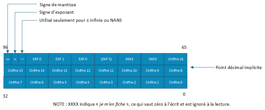 | Type de données | SM | SE | Y | Y | Exposant à 3 chiffres | Entier à 1 chiffre | Fraction à 16 chiffres |