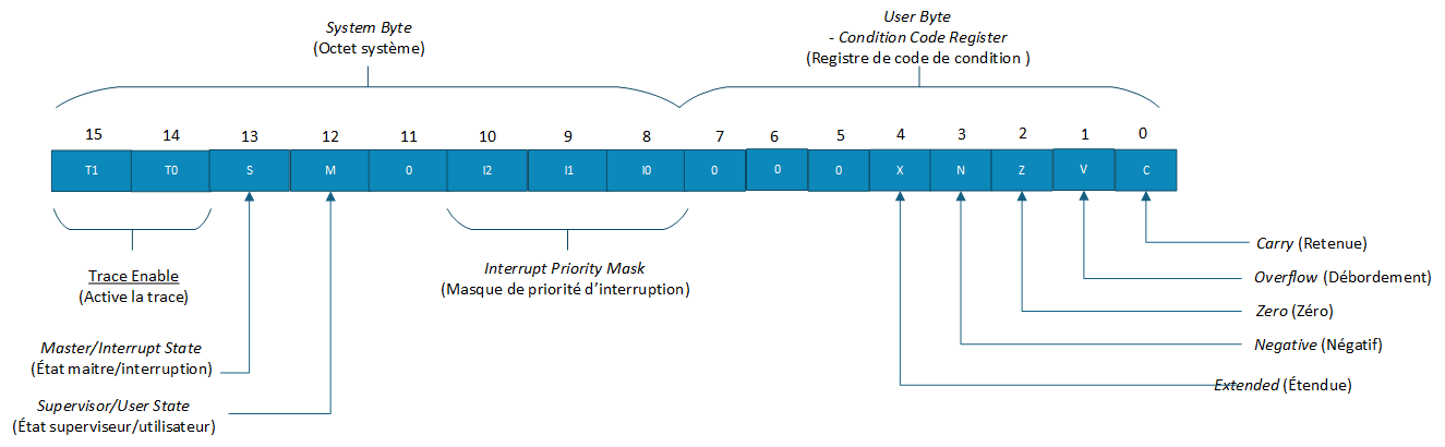 - X - Extend : Défini sur la valeur du bit C pour les opérations arithmétiques ; sinon, non affecté ou défini sur un résultat spécifié.
