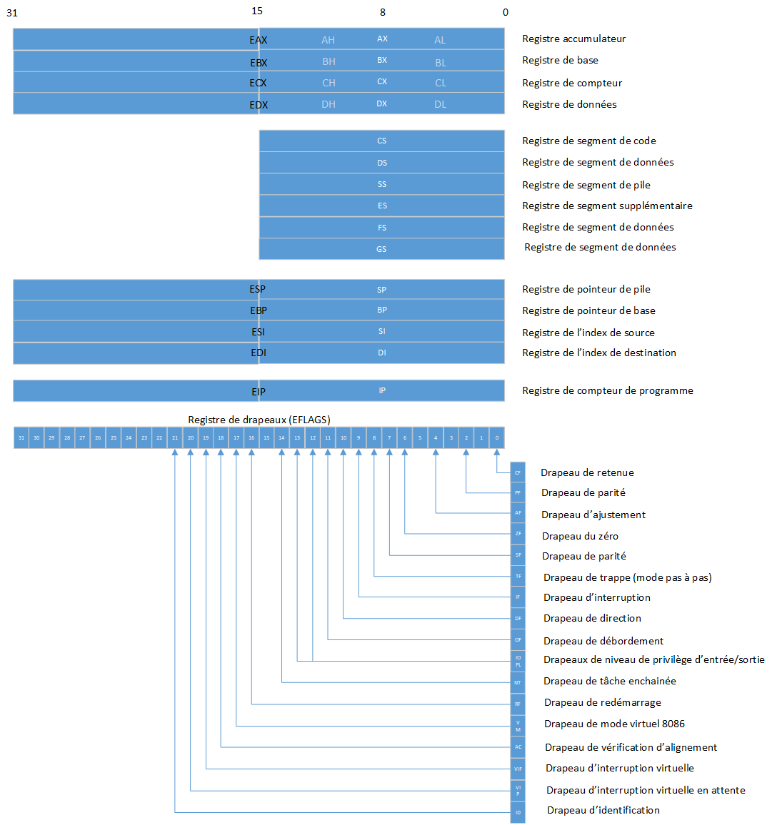 | PUSHFD | Push EFLAGS | Cette instruction permet d'empiler respectivement le registre 32 bits de drapeau des indicateurs d'état dans la pile. |