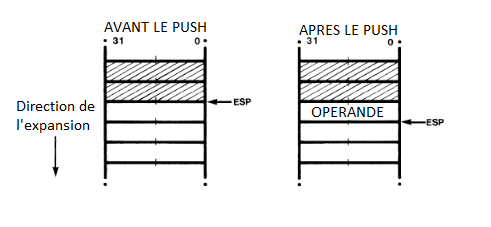 PUSH (Push) décrémente le pointeur de pile (ESP), puis transfère l'opérande source au sommet de la pile indiqué par ESP :