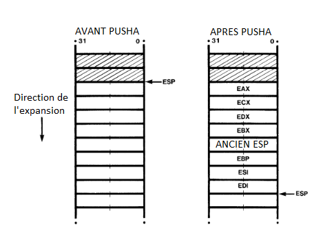Le microprocesseur pousse les registres généraux sur la pile dans l'ordre suivant : EAX, ECX, EDX, EBX, la valeur initiale de ESP avant que EAX ne soit poussé, EBP, ESI et EDI. PUSHA est complété par l'instruction POPA.