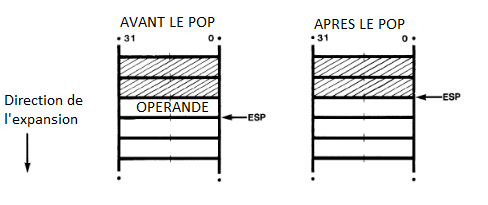 POP (Pop) transfère le mot ou le mot double au sommet actuel de la pile (indiqué par ESP) vers l'opérande de destination, puis incrémente ESP pour pointer vers le nouveau sommet de la pile :