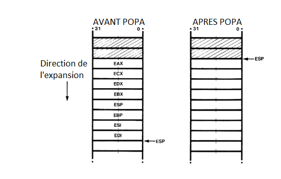POPA (Pop All Registers) restaure les registres sauvegardés sur la pile par PUSHA, sauf qu'il ignore la valeur sauvegardée de ESP :