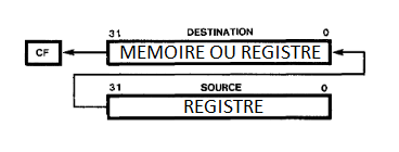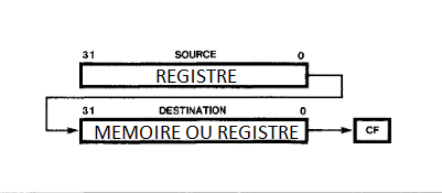 Les bits sont décalés de l'opérande de registre vers la mémoire ou l'opérande de registre. CF est mis à la valeur du dernier bit décalé hors de l'opérande de destination. SF, ZF et PF sont définis en fonction de la valeur du résultat. OF et AF ne sont pas définis.