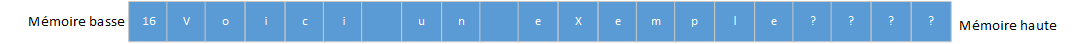 La chaîne de caractères «Voici un exemple» comporte 16 caractères. Le diagramme suivant montre comment ces caractères sont entreposés dans une chaîne de caractères déclarée comme comportant 20 caractères :