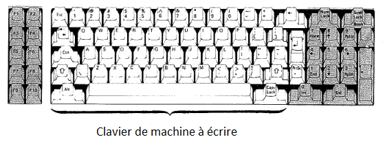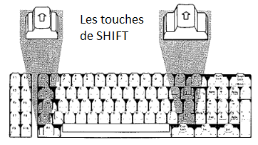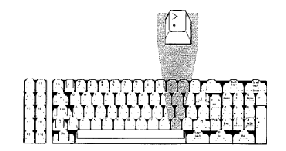 Ce clavier a des symboles spéciaux que vous ne trouverez pas sur une machine à écrire ordinaire, comme ^, [ et ] ; et certains caractères ne sont pas là où vous pourriez vous attendre à ce qu'ils soient si vous avez l'habitude d'utiliser une machine à écrire. Par exemple, le point supérieure (.) n'est pas un point, mais le symbole >.