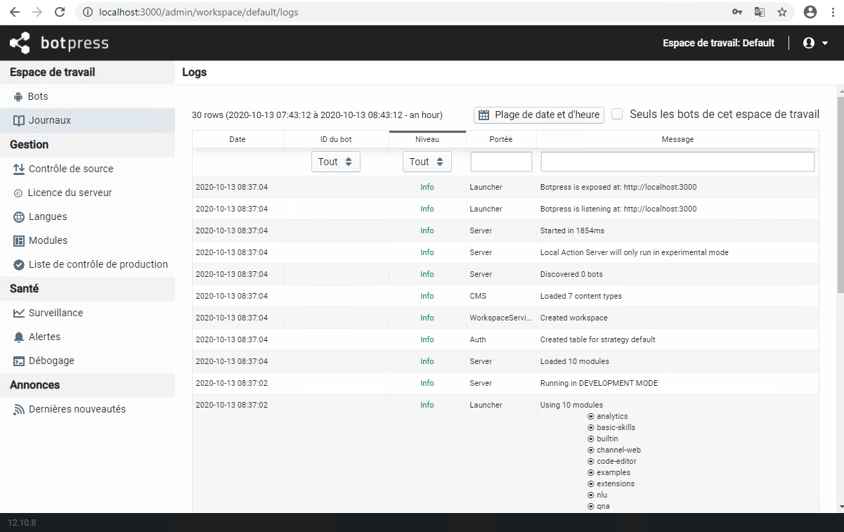 Le projet Botpress est une plate-forme de création de robots tout-en-un open source, développer en TypeScript fournissant tous les outils dont vous avez besoin pour créer, déboguer et déployer des assistants conversationnels basés sur l'IA. Les canaux intégrés comprennent : Facebook Messenger, Slack, Microsoft Teams, Skype, Webchat et Telegram. Le projet Botpress à comme objectif d'être axé sur les développeurs, la compréhension du langage naturel (NLU), l'interface graphique intégrée et éditeur de flux, le panneau d'administration et outils de gestion de bot, fonctionne entièrement sur un site (vous contrôlez vos données). Pour son fonctionnement interne, le projet Botpress utilise de nombreuses bibliothèques connu de façon optionnelle ou intensive comme par exemple Lodash, FastText, SVM, SentencePiece, ml-kmeans, axios, moment, nanoid,...