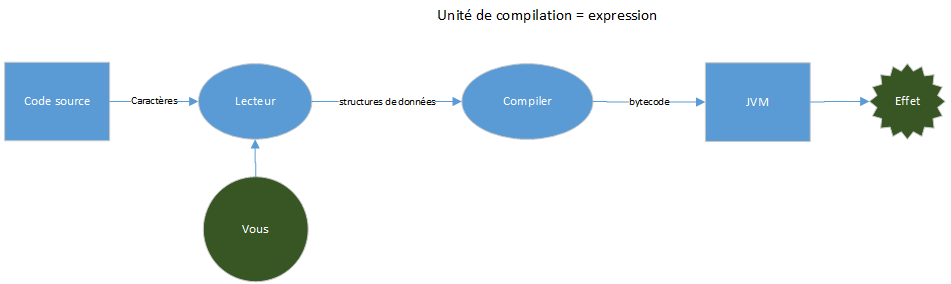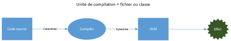 En Java, le code source (fichiers .java) est lu comme des caractères par le compilateur (javac), produisant du bytecode (fichiers .class) pouvant être chargé par la JVM.
