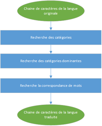 Les traducteur humaines les plus simples sont basés sur trois modules éléments. Le premier recherche toutes les catégories de chacun des mots trouvés dans la texte (la chaîne de caractères) à traduire. La deuxième recherche recherche parmi tout les mots, la catégorie dominante du texte. Cette catégorisation est très importantes, car de nombreux langues, certaines mots peuvent avoir plusieurs sens et peuvent carrément changé le contexte d'une langue à l'autre. La troisième recherche recherche les meilleurs mots correspondant en fonction de la catégorie domaine. La recherche d'une correspondance d'un mot dans un autre langue nécessite nécessairement une table de base de données permettant d'associer plus facilement l'un des langues à l'autre langue. La deuxième table contiendra les différentes catégories correspondants à la langue et sens du mot.