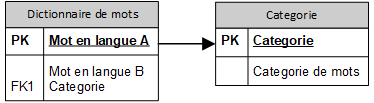 Pour pouvoir faire fonctionner la recherche de correspondance de mots, on utilisera la table «Dictionnaire de mots», laquelle renfermera le mot de langue A (soit la langue d'origine) et le mot de langue B (soit le langue traduite) et un numéro de catégorie dans lequel la classer lequel sera définit dans une autre table appelé Categorie. Par conséquent, on aura au minimum les tables (Dictionnaire de mots, Categorie) de base de données suivantes :