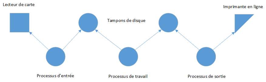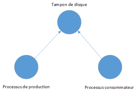 La figure suivante montre ce petit système et ses trois composantes : un processus produisant des données, un processus consommant des données et un tampon de disque les reliant :