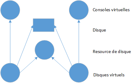 Si le disque tombe en panne de manière persistante pendant l'entrée/sortie, cela doit être signalé sur la console d'un opérateur. L'image précédente montre deux instances d'un type de classe, appelé console virtuelle. Elles donnent aux disques virtuels l'illusion qu'ils ont leurs propres consoles privées.