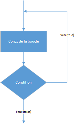 Au début, le corps de la boucle est exécuté. Ensuite, sa condition est vérifiée. Si elle est vraie, le corps de la boucle est répété, sinon la boucle se termine. Cette logique est répétée jusqu'à ce que la condition de la boucle soit rompue. Le corps de la boucle est exécuté au moins une fois. Si la condition de la boucle est constamment vraie, la boucle ne se termine jamais.