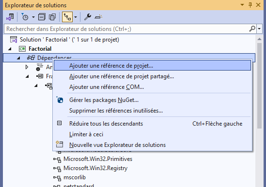 Pour utiliser BigInteger, nous devons d'abord ajouter une référence de notre projet à l'assembly System.Numerics.dll (il s'agit d'une bibliothèque .NET standard pour travailler avec des entiers très grands, n'étant pas référencée par défaut par nos projets Visual Studio). L'ajout d'une référence à celui-ci se fait en cliquant avec le bouton droit sur les références du projet actuel dans la fenêtre Explorateur de solutions de Visual Studio :