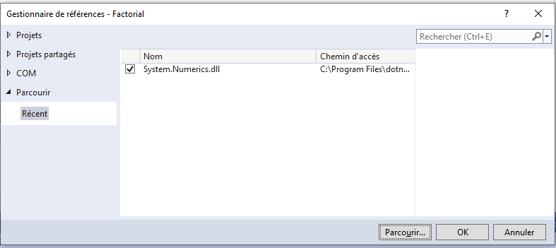 Nous recherchons et choisissons l'assembly System.Numerics.dll dans la liste :