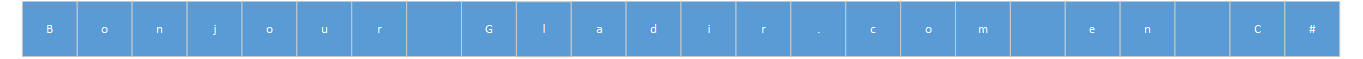Nous venons de déclarer la variable machaine de type string dont le contenu est la phrase textuelle est «Bonjour Gladir.com en C#». La représentation du contenu dans la chaîne de caractères ressemble de près à ceci :