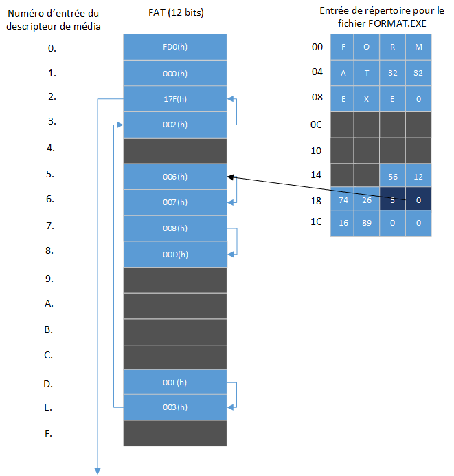 Remarque : Le premier nombre hexadécimal entre parenthèses fait référence à une FAT dont les entrées ont une largeur de 16 bits.