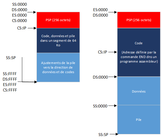 Une comparaison des programmes .COM et .EXE en mémoire :
