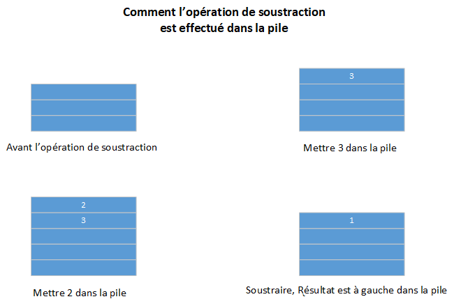 La figure suivante illustre l'impact d'une simple opération de soustraction (3-2) sur la pile. En haut à gauche dans le figure, trois nombres sont sur la pile, mais leur nature importe peu. Dans les haut à droite de la figure et dans le bas à gauche de la figure, les deux opérandes sont «poussés» sur la pile. Dans la bas à droite de la figure, après l'opération de soustraction, les opérandes ont disparu et seul le résultat reste sur la pile. Notez que la pile se «construit» vers la mémoire basse ; chaque nombre est poussé sur la pile à une adresse inférieure à celle du nombre précédent :