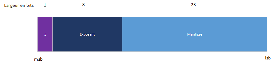 Les types à virgule flottante ont un format binaire d'entreposage divisé en trois champs distincts : la mantisse, l'exposant et le bit de signe entrepose le signe de la valeur à virgule flottante.