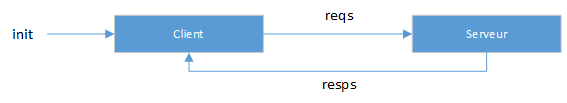 où nous supposons que next est une fonction qui, à partir d'une réponse du serveur, détermine la requête suivante, et process est une fonction traitant une requête du client, renvoyant une réponse appropriée.