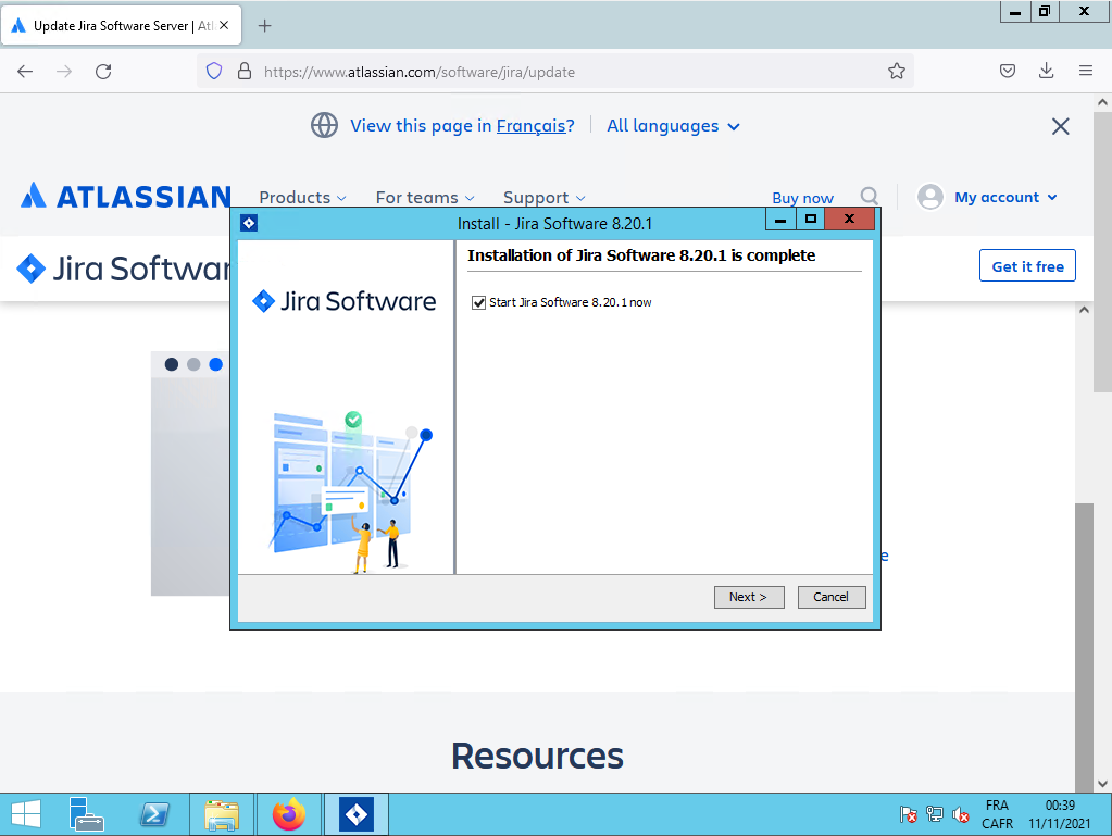 Une fois l'installation terminé, il vous propose de lancer le serveur JIRA, vous cochez «Start Jira Software 8.20.1 now» et vous cliquez sur le bouton Next :