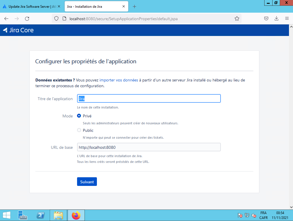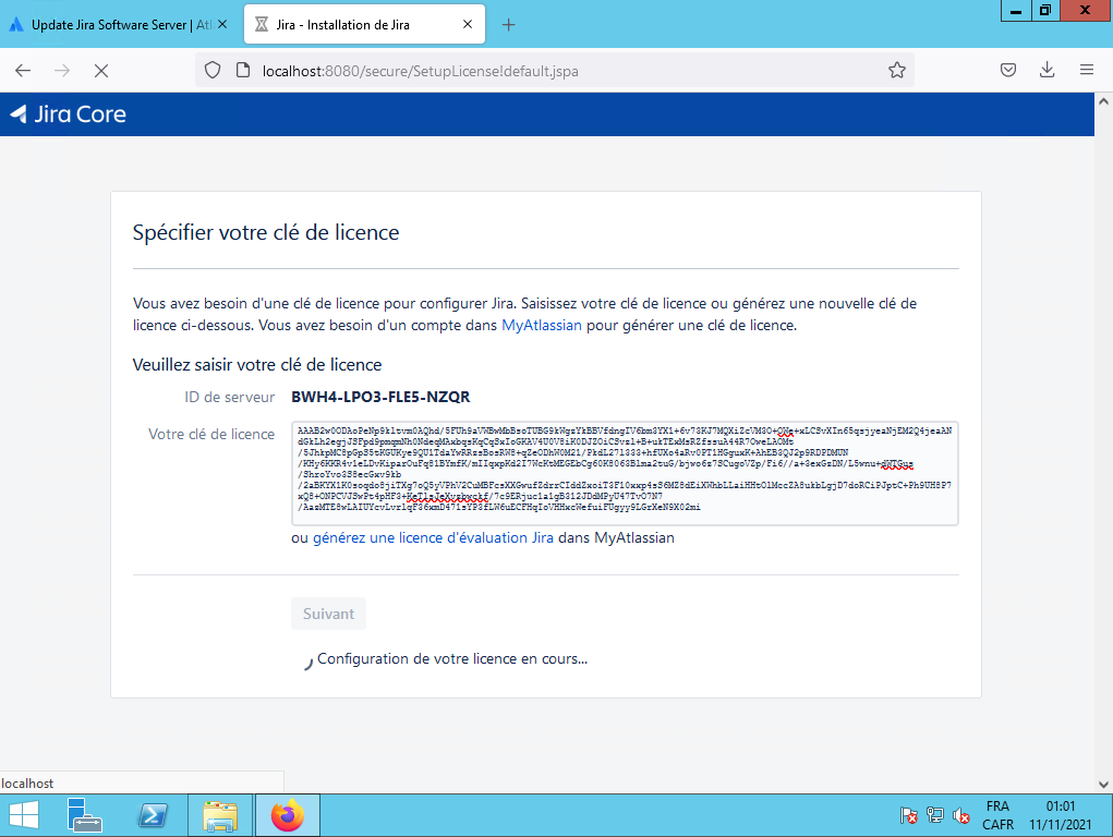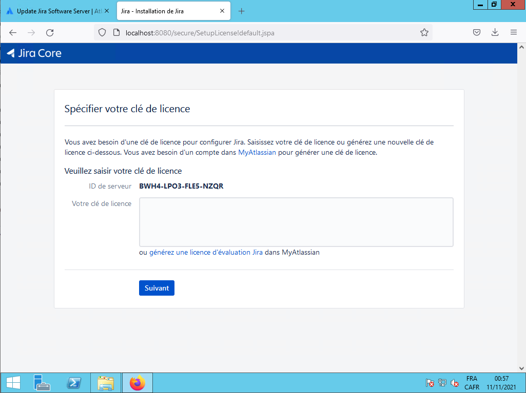 Il vous demande votre clef JIRA, vous aller sur le site Web de Atlassian et vous demandez la clef et vous l'entrez ensuite dans le champ «Votre clé de licence», ensuite vous cliquez sur le bouton Suivant :