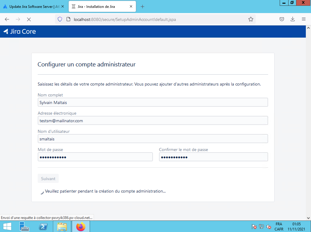 Il crée le compte administrateur, vous le laissez continuer :