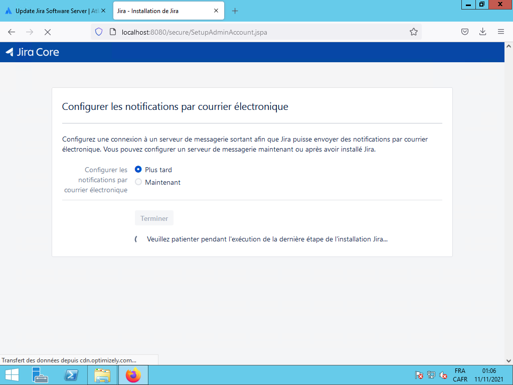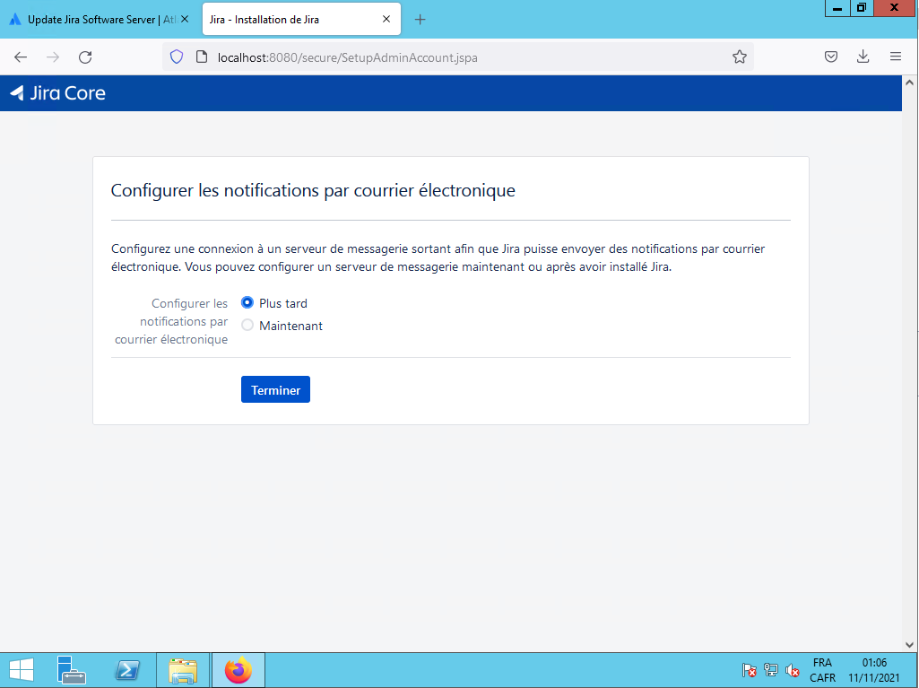 Il vous demande de configurer les avertissements par courriel, vous sélectionnez le bouton radio «Plus tard» et vous cliquez sur le bouton Terminer :