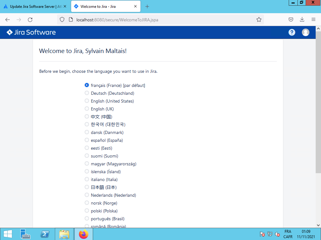 Vous sélectionnez la langue de JIRA, vous choisissez le bouton radio «français (France) [par défaut]» et vous cliquez sur le bouton plus bas :