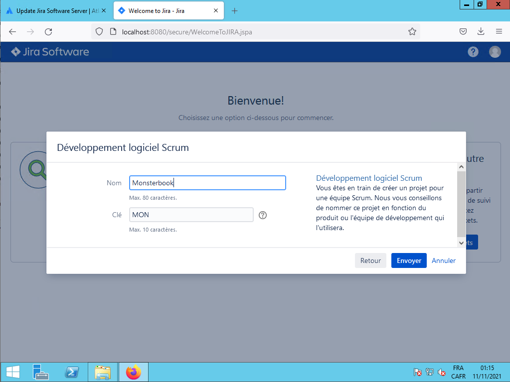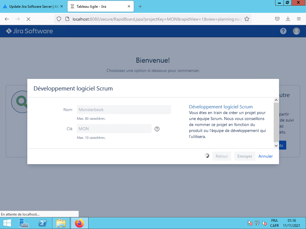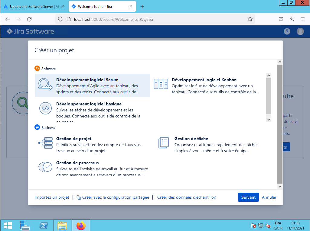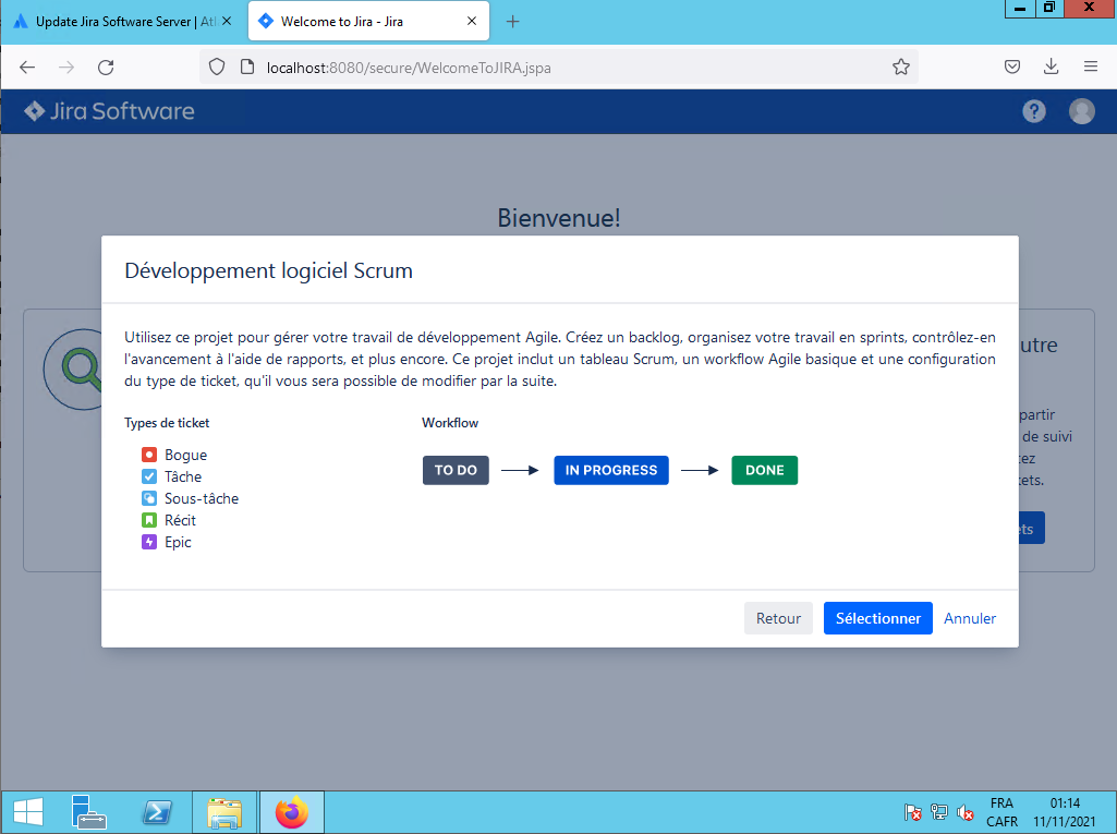 Vopus choisissez «Développement logiciel Scrum» et vous cliquez sur le bouton Suivant :