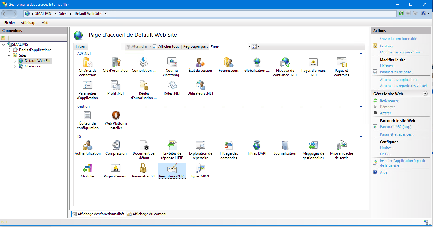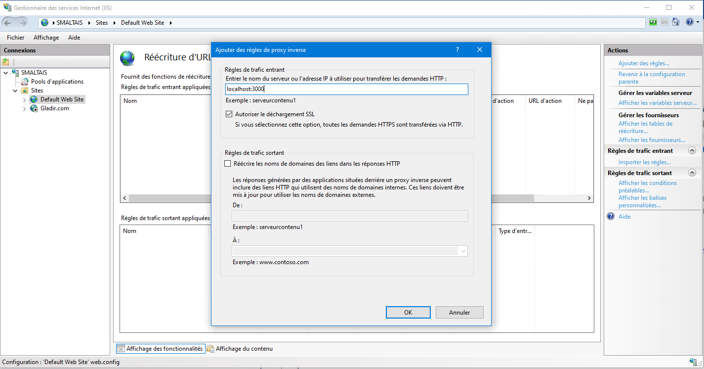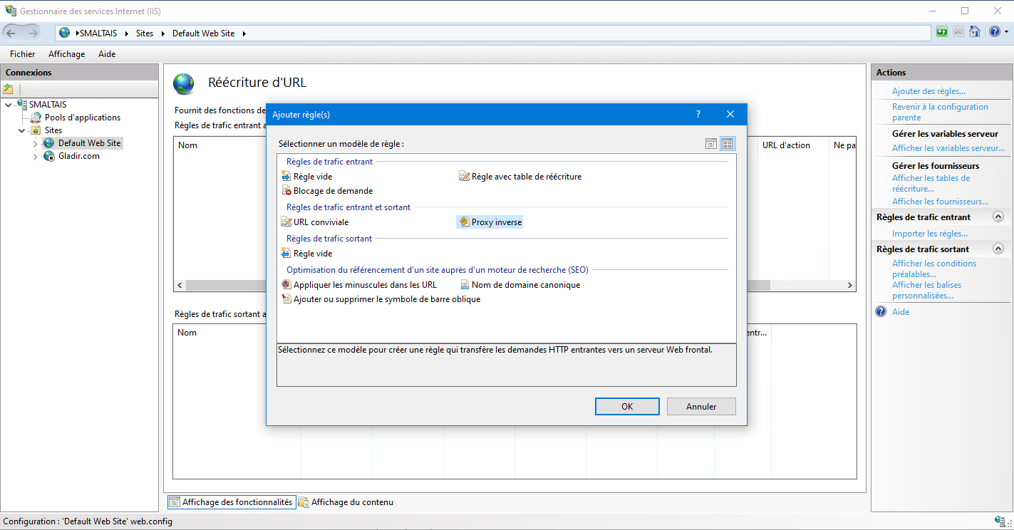 Pour configurer IIS en tant que proxy inverse, vous devez installer l'extension de réécriture d'URL (URL Rewrite) et l'extension de routage de demande d'application. L'extension de réécriture d'URL (URL Rewrite) vous permet de définir des règles pour activer des URL plus faciles à mémoriser pour les utilisateurs et pour les moteurs de recherche. L'extension Application Request Routing permet des fonctionnalités d'évolutivité: équilibrage de charge, routage basé sur des règles,...