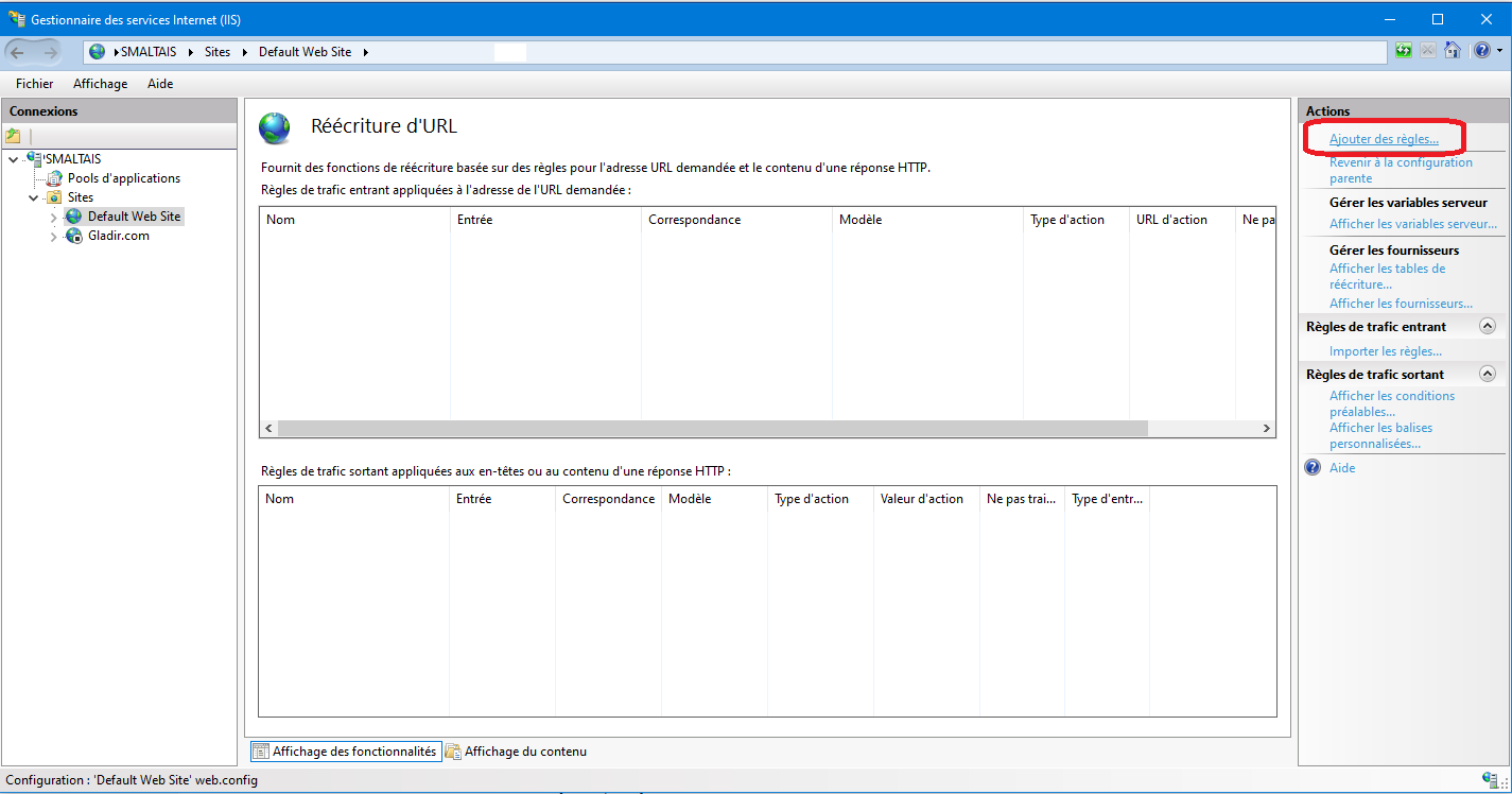 Une fois dans la réécriture URL, vous cliquez sur le lien «Ajouter une règles» (Add a new rule en anglais) :