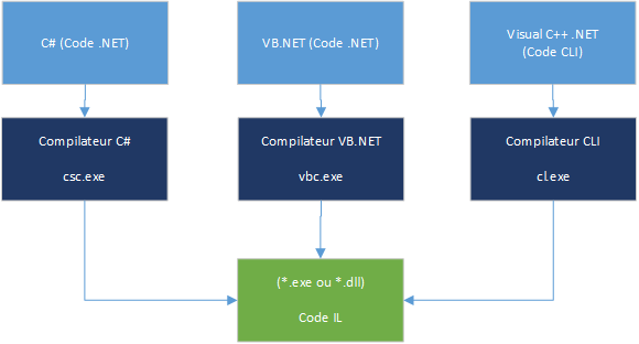 La figure suivante démontre apparemment que chaque code source de programmation autorisé .NET est finalement compilé en MSIL plutôt que directement dans un ensemble d'instructions spécifique. Ce potentiel permet à tous les langages pris en charge par .NET d'interagir entre eux. De plus, le code MSIL offre les mêmes avantages auxquels les professionnels Java sont habitués :