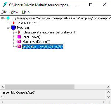 Le fichier ILDASM.EXE charge tout assembly .NET et analyse son contenu, notamment le code MSIL, le manifeste et les métadonnées. Il est généralement capable de récupérer toutes les métadonnées des binaires .NET dans une représentation d'opcode CIL. Double-cliquez sur la méthode de calcul du test (testCalcul) pour examiner le code MSIL généré sous-jacent, comme illustré ci-dessous :